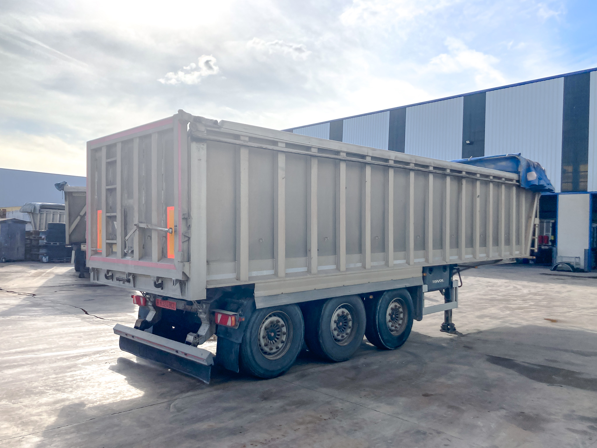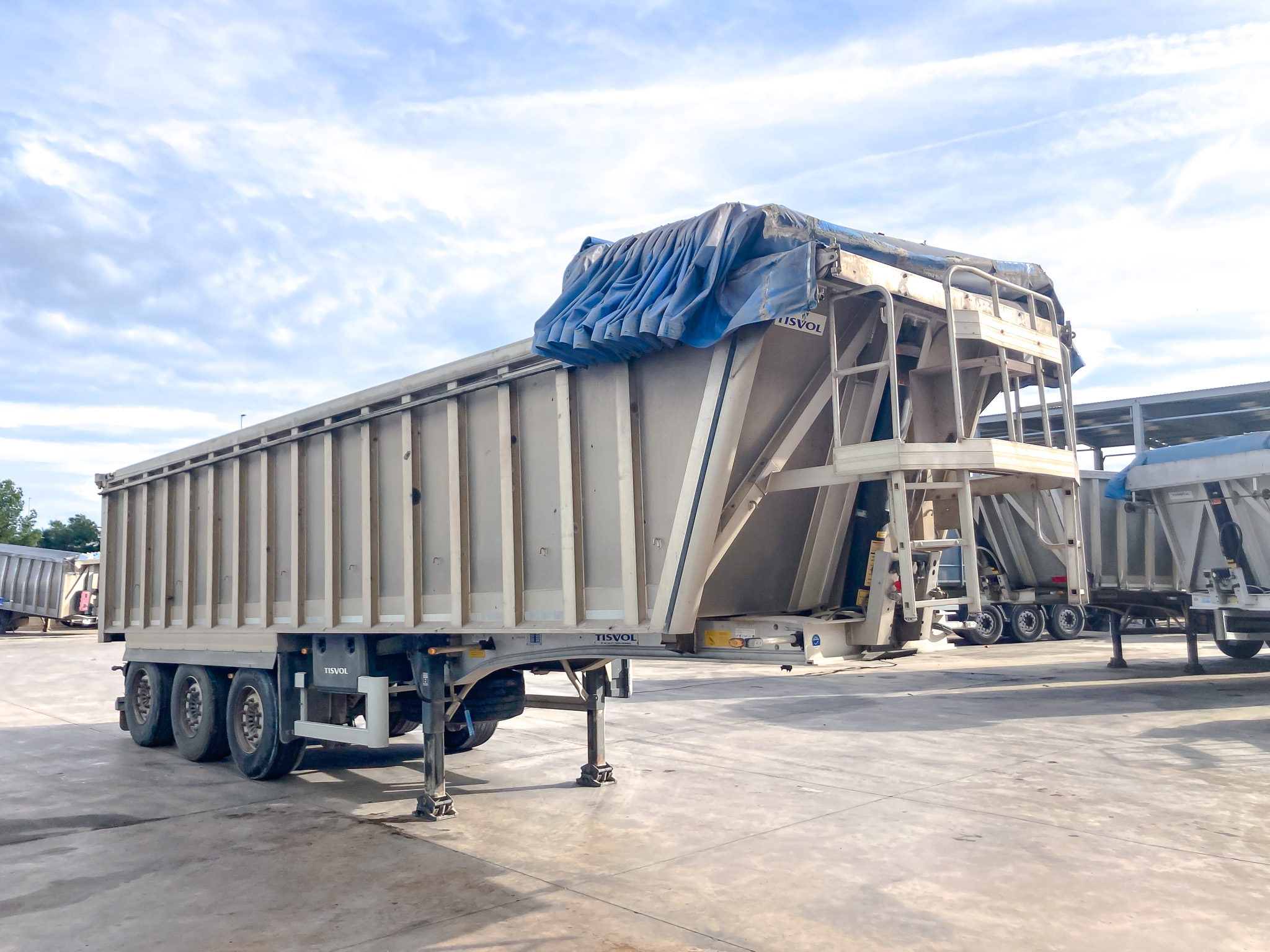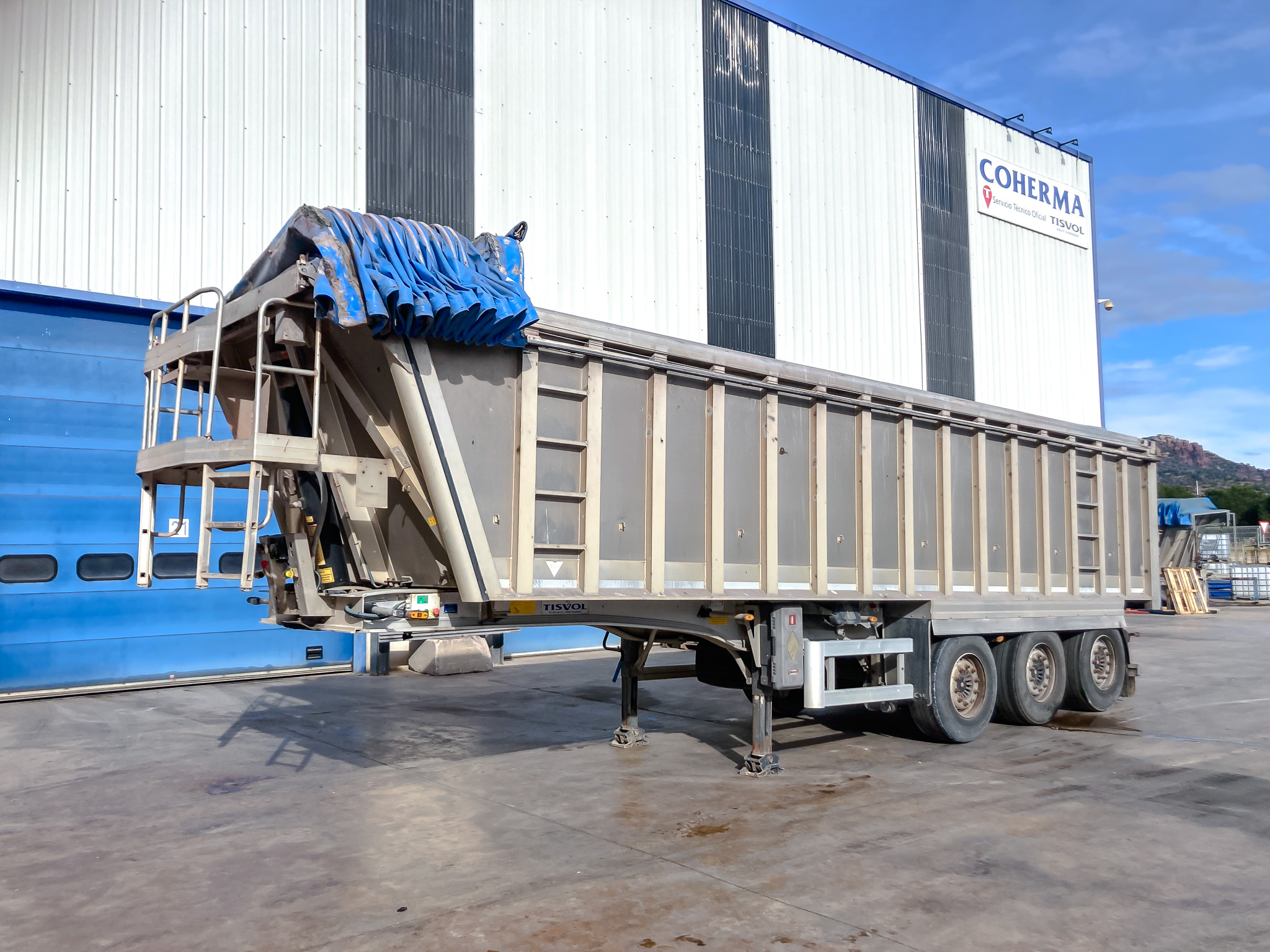 Semirremolque Tisvol de 38 m³ del año 2011, con una longitud de 9.500 mm y altura lateral de 1.700 mm. Vehículo de aluminio integral con caja de costillas en aluminio, equipado con ejes SAF, suspensión neumática y frenos de disco. Dispone de elevador en el 1º y 2º eje, cilindro exterior marca Hyva, llantas de acero y toldo corredero automático eléctrico. Puerta basculante y lateral.