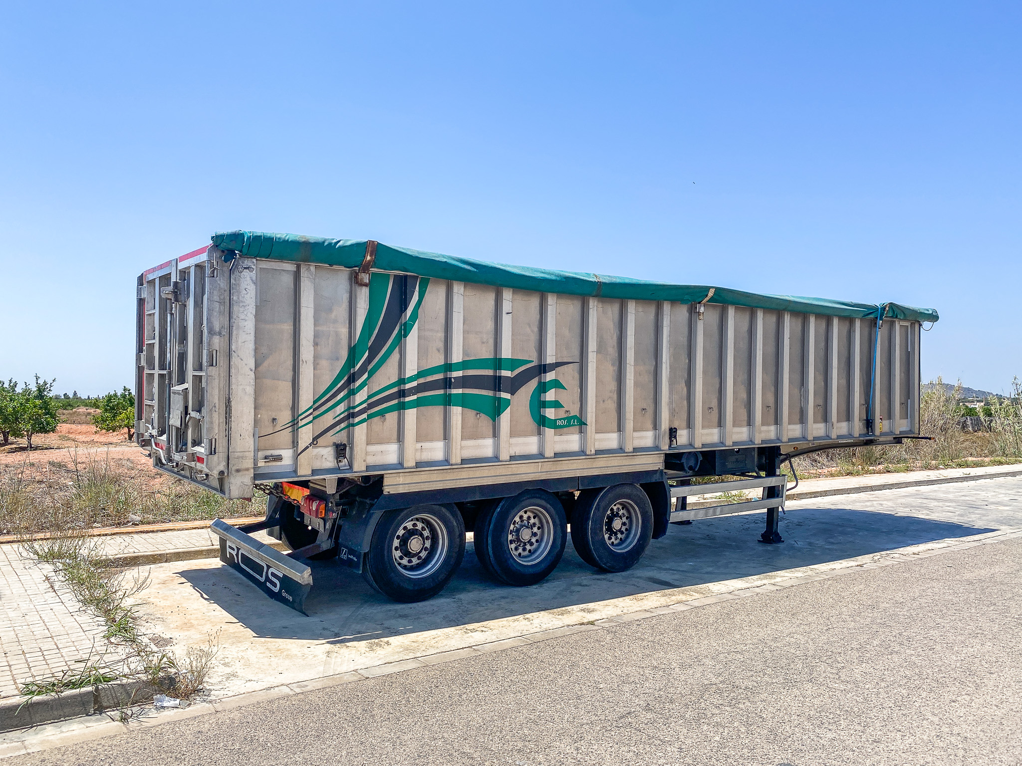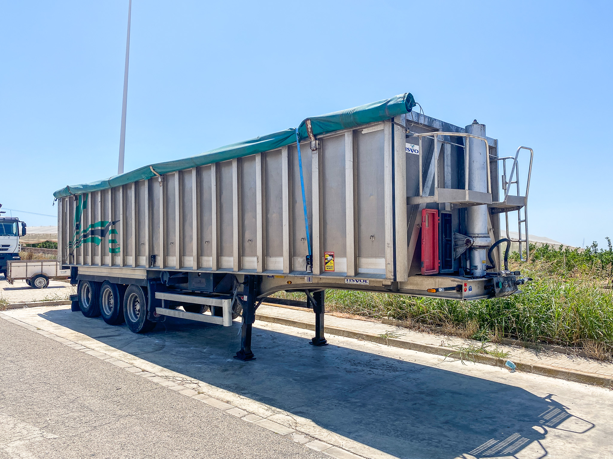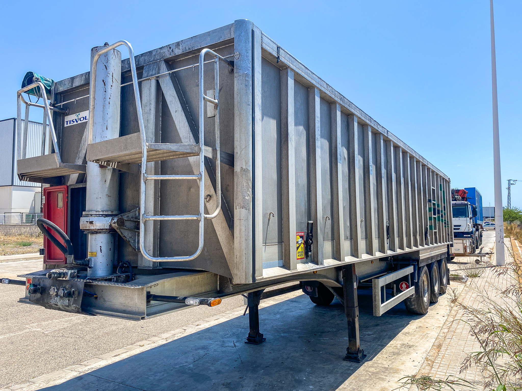 Semirremolque Tisvol de 46m³ del año 2006, longitud del vehículo 11.000 mm y altura de 1.800 mm, vehículo de aluminio integral. Ejes ROR, suspensión neumática, frenos de disco, elevador en 1º eje con llantas de acero, caja de costillas en aluminio, cilindro exterior de campana marca Hyva, ABS, y toldo de apertura al lateral. Puerta universal (basculante y libro).